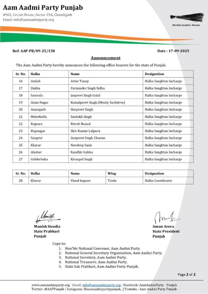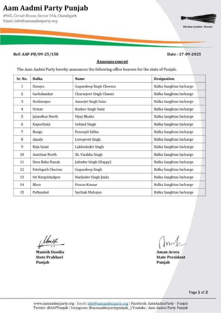 आम आदमी पार्टी (आप) पंजाब ने मंगलवार को संगठनात्मक स्तर पर बड़ा फैसला लिया है। पार्टी की ओर से 27 विधानसभा हलकों में नए हलका संगठन इंचार्जों के नामों का ऐलान किया गया है। इसके साथ ही खड़ड़ हलके में ट्रेड विंग के हलका को-ऑर्डिनेटर की नियुक्ति भी की गई है।