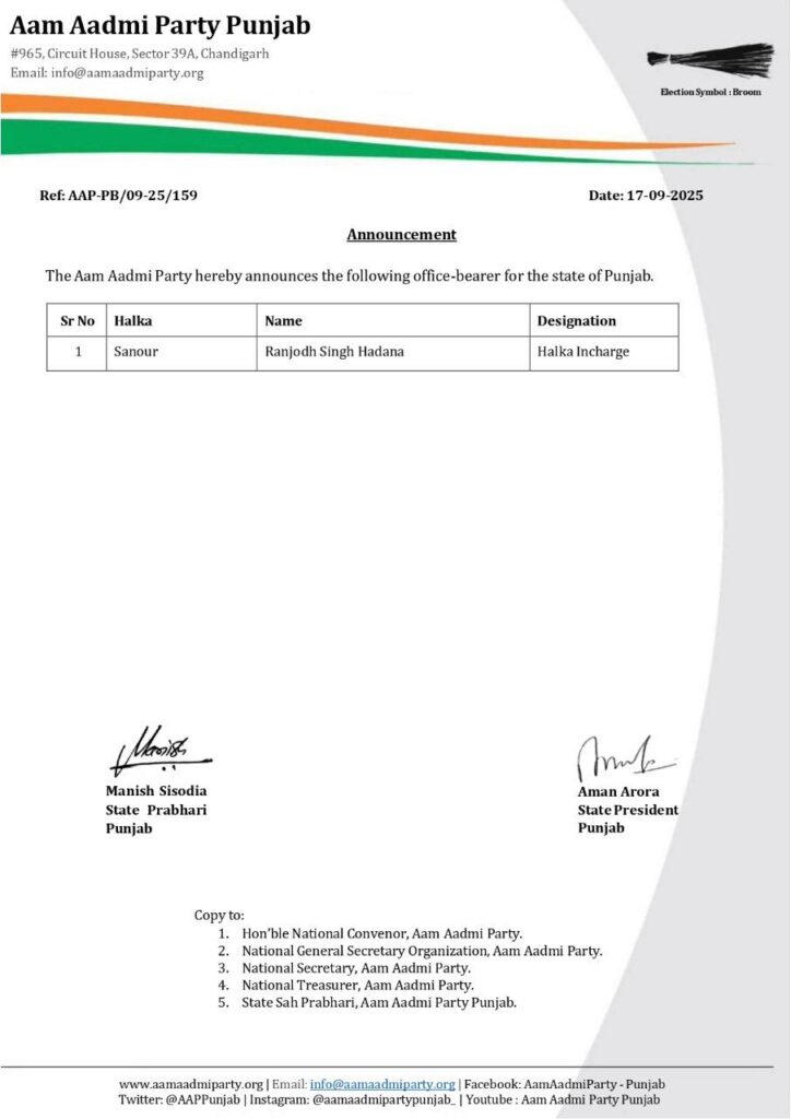 पार्टी ने हलका सनौर से भी संगठन इंचार्ज का ऐलान किया है। इस हलके से रणजोध सिंह हंढाणा को हलका इंचार्ज नियुक्त किया गया है। पार्टी की ओर से उन्हें भी बधाई दी गई है और विश्वास जताया गया है कि वह अपने क्षेत्र में पार्टी की नीतियों को मजबूती से आगे बढ़ाएँगे।