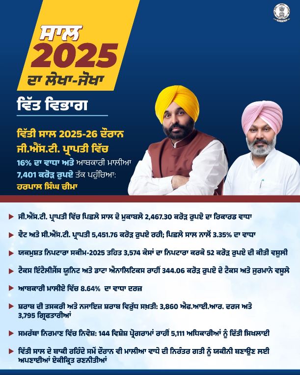 पंजाब सरकार को वित्तीय वर्ष 2025-26 के दौरान बड़ी आर्थिक सफलता मिली है। राज्य के वित्त, योजना, आबकारी और कर मंत्री एडवोकेट हरपाल सिंह चीमा ने बताया कि नवंबर 2025 तक पंजाब ने GST संग्रह में 16.03 प्रतिशत की उल्लेखनीय वृद्धि दर्ज की है। इस अवधि में राज्य को 17,860.09 करोड़ रुपये का GST राजस्व प्राप्त हुआ, जबकि आबकारी से 7,401 करोड़ रुपये की आमदनी हुई है।