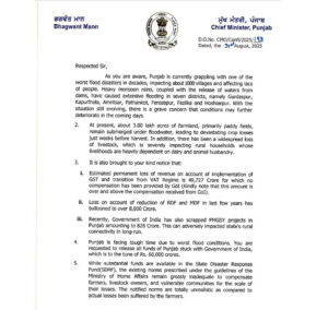 सीएम मान ने अपने पत्र में लिखा है कि अब तक पंजाब के करीब 1000 गांव बाढ़ की चपेट में आ चुके हैं। गुरदासपुर, कपूरथला, अमृतसर, पठानकोट, फिरोजपुर, फाजिल्का और होशियारपुर सबसे ज्यादा प्रभावित जिले हैं। उन्होंने बताया कि लगभग 3 लाख एकड़ कृषि भूमि पानी में डूब गई है, जिससे किसानों को भारी नुकसान उठाना पड़ रहा है।