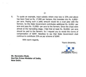 मुख्यमंत्री ने केंद्र से अपील की कि एसडीआरएफ (SDRF) के नियमों में बदलाव किया जाए ताकि किसानों को दी जाने वाली मुआवजा राशि को बढ़ाकर 50,000 रुपये प्रति एकड़ किया जा सके। मान ने कहा कि पंजाब सरकार पहले ही यह फैसला ले चुकी है, लेकिन इसके लिए केंद्र की मंजूरी आवश्यक है।