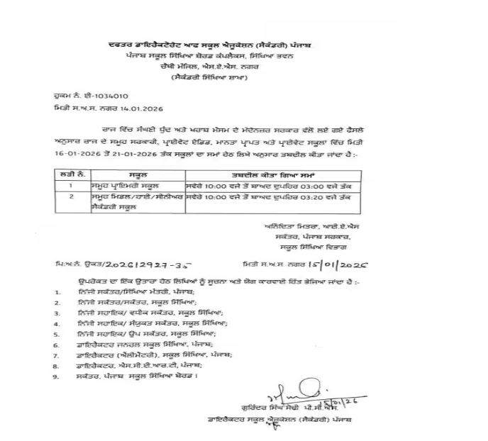 पंजाब के स्कूल शिक्षा निदेशालय (सेकेंडरी) द्वारा जारी आदेशों के अनुसार यह फैसला राज्य के सभी सरकारी, प्राइवेट सहायता प्राप्त, मान्यता प्राप्त और निजी स्कूलों पर लागू होगा। यानी किसी भी श्रेणी के स्कूल को इससे बाहर नहीं रखा गया है। यह नया समय 16 जनवरी से 21 जनवरी तक लागू रहेगा।
