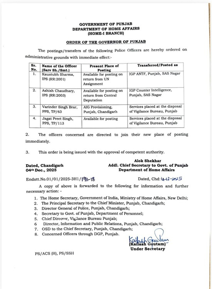 जारी आदेश के अनुसार, कौस्तुभ शर्मा को IGP ANTF पंजाब, SAS नगर में तैनात किया गया है। वहीं, अशीष चौधरी को IGP काउंटर इंटेलिजेंस पंजाब, SAS नगर में नया चार्ज सौंपा गया है। इस प्रकार दोनों अधिकारियों को सुरक्षा और खुफिया विभागों में जिम्मेदारी दी गई है।
