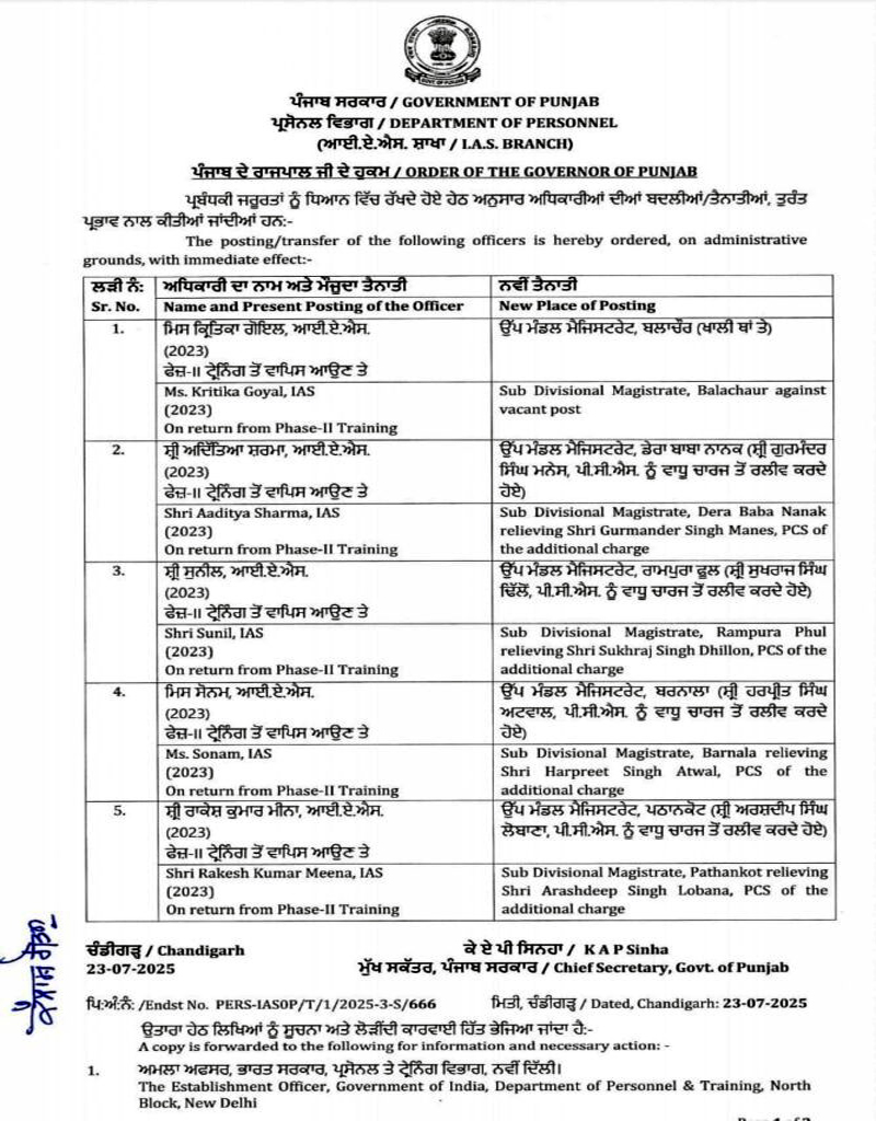 पंजाब सरकार ने एक बड़ा प्रशासनिक फैसला लेते हुए राज्य के 5 वरिष्ठ IAS अधिकारियों के तबादले कर दिए हैं। सरकार की ओर से जारी आधिकारिक आदेशों के अनुसार ये तबादले तुरंत प्रभाव से लागू माने जाएंगे। जिन अधिकारियों को नई जिम्मेदारियां सौंपी गई हैं, उनमें अदित्या शर्मा, कृतिका गोयल, सुनील, सोनम और राकेश कुमार मीणा शामिल हैं। यह कदम शासन व्यवस्था को और अधिक प्रभावी एवं सुचारू बनाने की दिशा में उठाया गया है। सरकार द्वारा किए गए इस अहम फेरबदल को राज्य में प्रशासनिक ढांचे को मजबूत करने के तौर पर देखा जा रहा है। तबादलों की पूरी सूची संबंधित विभागों को भेज दी गई है ताकि अधिकारियों को जल्द से जल्द नए पदभार ग्रहण करने में कोई रुकावट न आए।